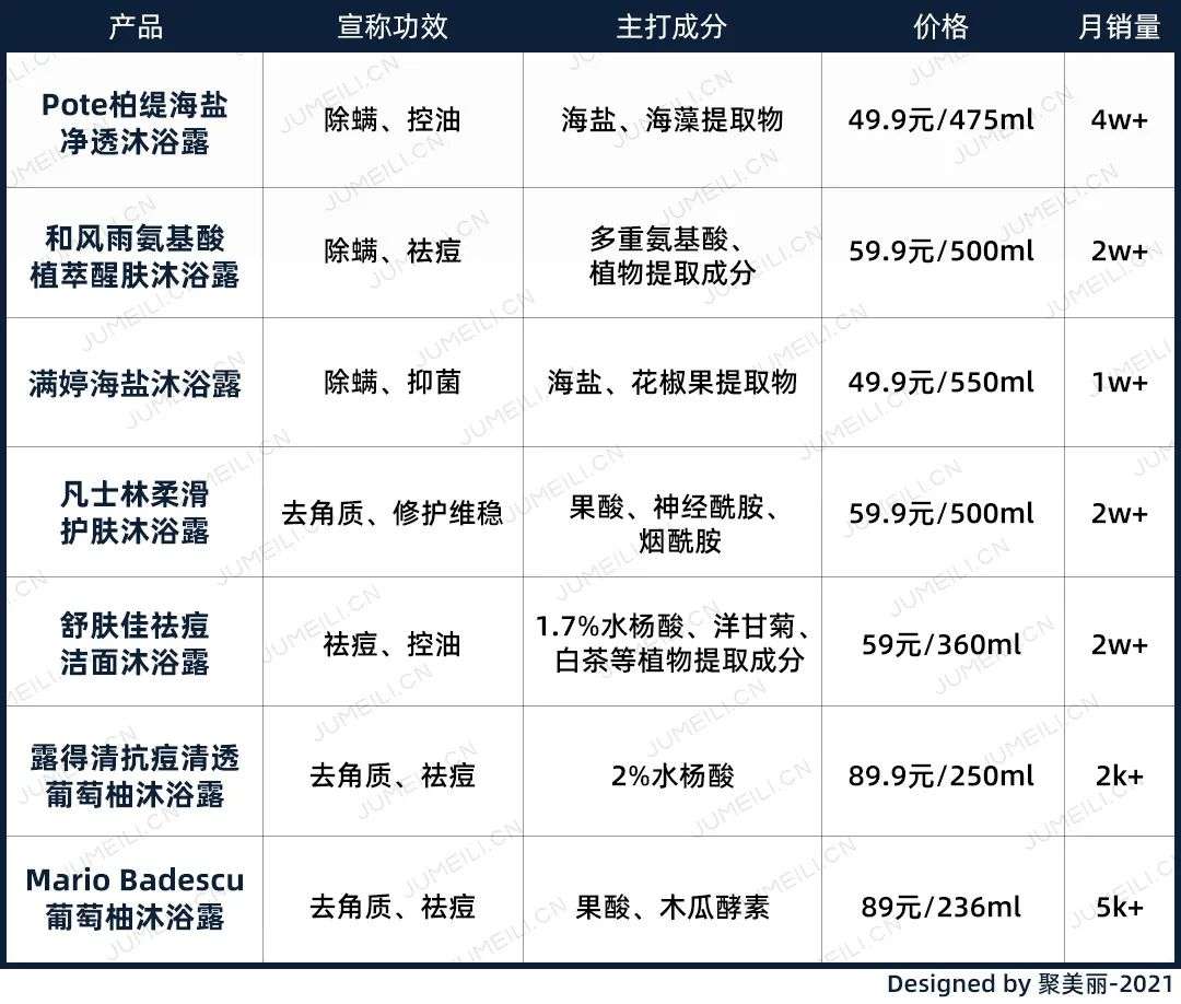 此外,近几年以去角质、祛痘为主要作用宣称的洗护产品中,水杨酸、果酸等“酸类”成分也受到了高度关注。以下表格以沐浴露为例,不完全统计了淘宝平台上不同价位销量较高的功能性洗护产品。