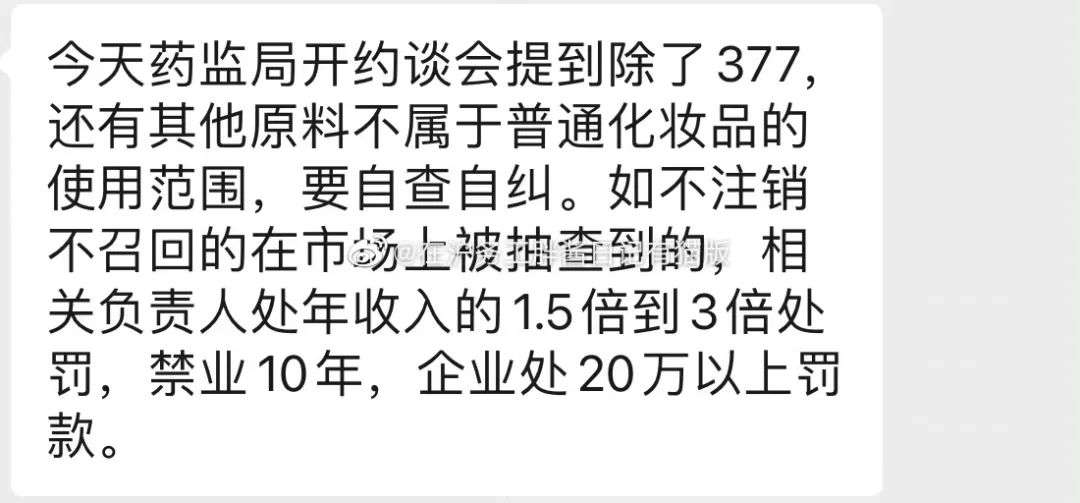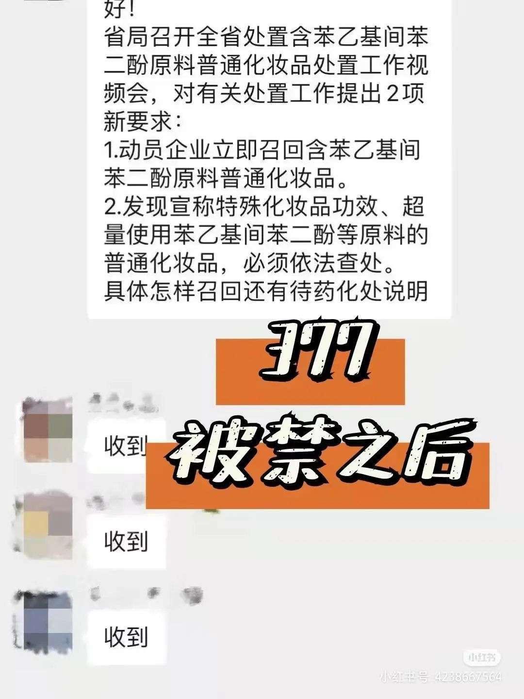 这两天,更是流传出地方药监局“开始动员企业召回377非特化妆品,并将对宣称美白功效、超量使用377的依法进行查处”的消息。