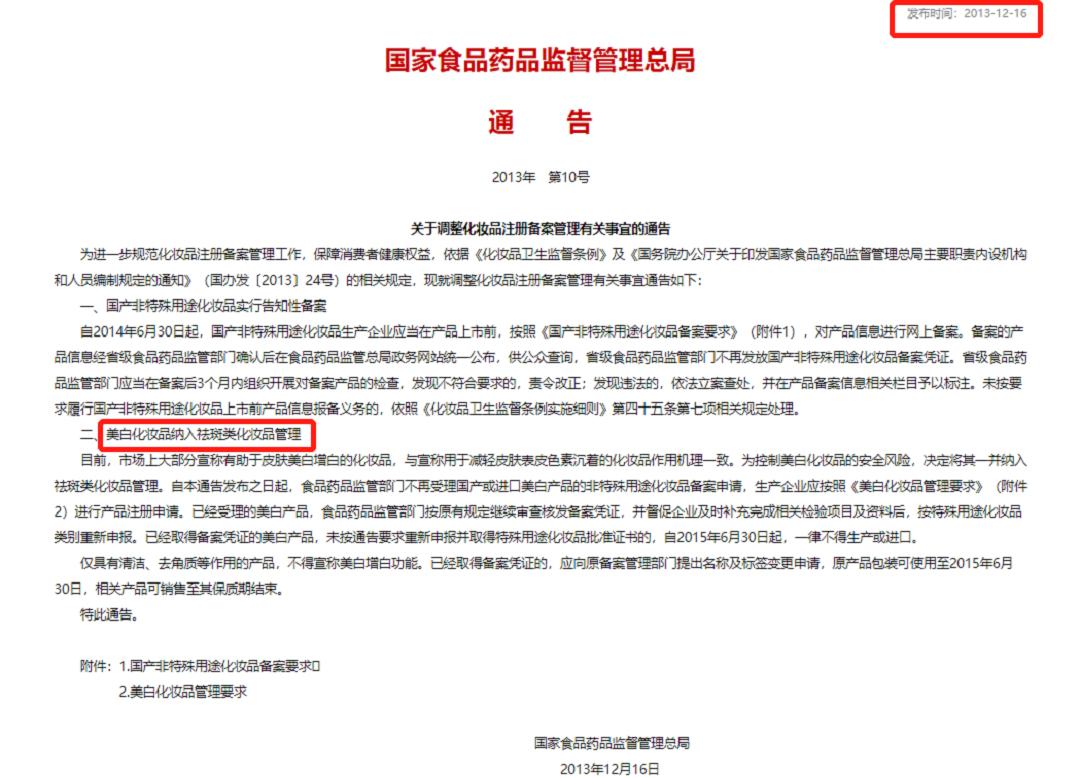 据此,聚美丽查询了药监局官网和《已使用化妆品原料目录(2021年版)》(后文简称《目录》),证实了其提供的信息。药监局官网信息显示,2013年12月16日,美白产品被纳入特殊用途化妆品管理之中。