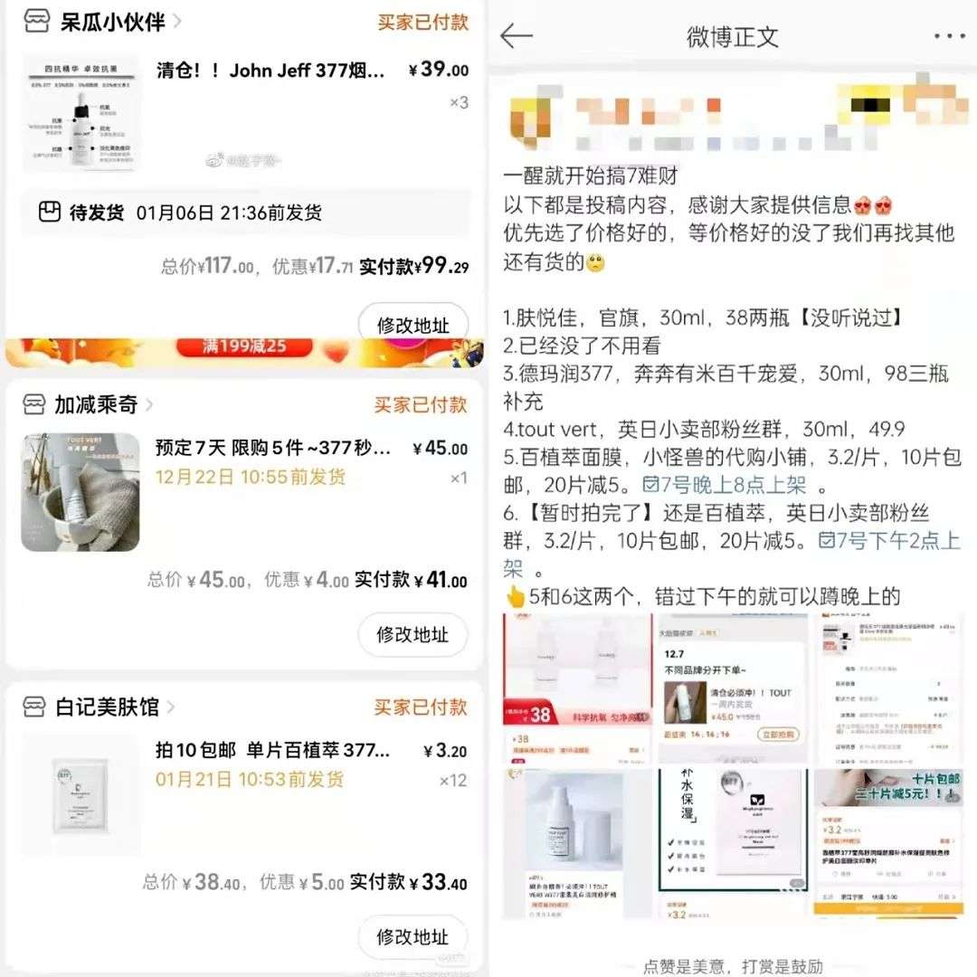 根据一些博主发布的“攻略”,百植萃377面膜每片清仓价为3.2元,悦肤佳377VC精华液清仓价为38元两瓶,John Jeff377精华清仓价为39元,TOUT VERT焕亮精华液清仓价为45元或49.9元。
