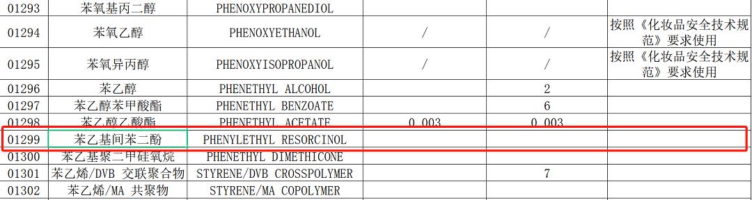 其二,《已使用化妆品原料目录(2021年版)》把苯乙基间苯二酚列入其中,但没有功效说明。