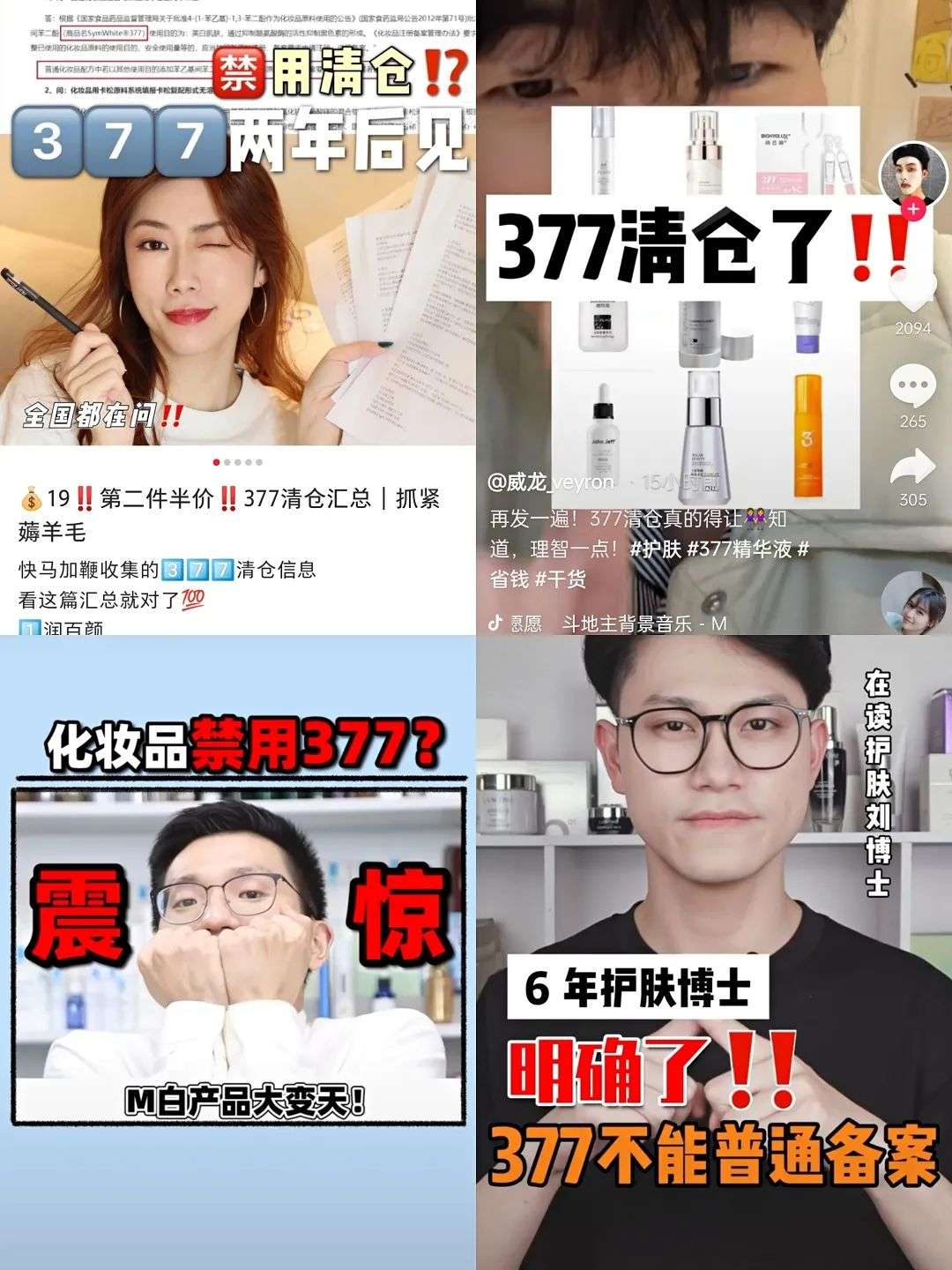 此外,在抖音和小红书上,聚美丽还发现“377清仓了”、“377不能用于普通化妆品备案”等成为了美妆博主们的视频素材之一。