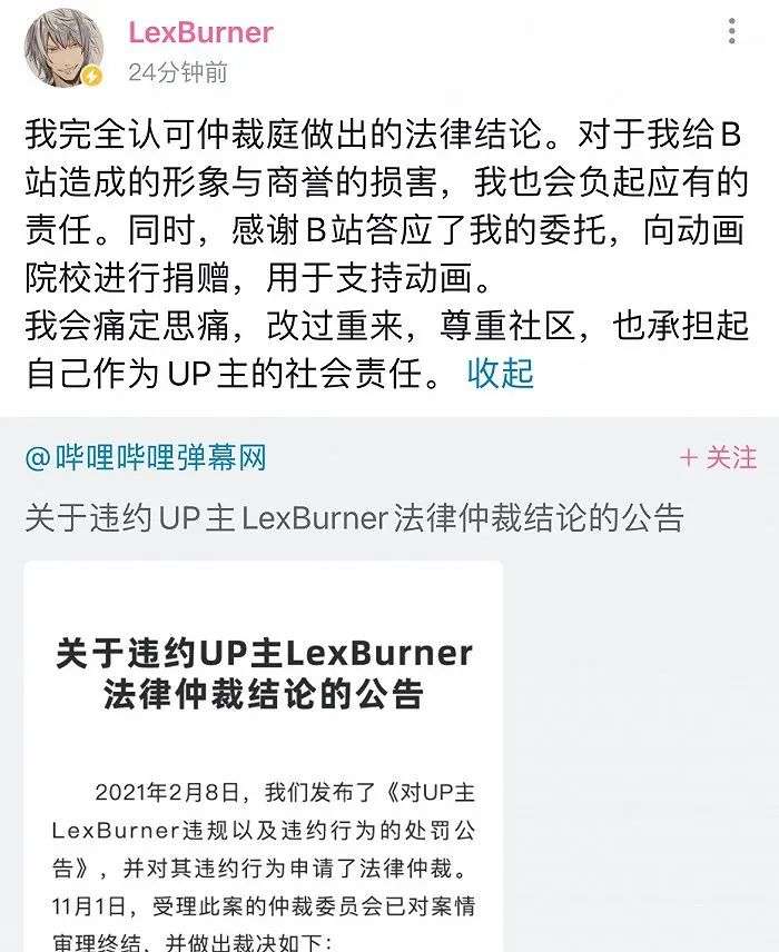 而LexBurner也在昨日晚间回应称,“我完全认可仲裁庭做出的法律结论。对于我给B站造成的形象与商誉的损害,我也会负起应有的责任。同时,感谢B站答应了我的委托,向动画院校进行捐赠,用于支持动画。我会痛定思痛,改过重来,尊重社区,也承担起自己作为UP主的社会责任。”