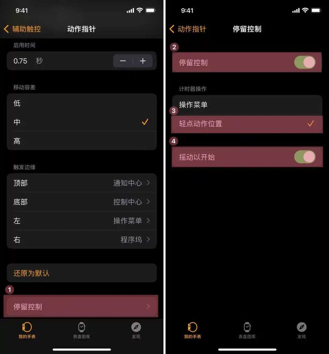 但这显然太麻烦了。其实,动作指针可以通过晃动手腕开启,方法是进入「辅助触控」>「动作指针」>「停留控制」(Dwell Control),打开「停留控制」和「摇动以开始」两个开关,并将「计时器操作」选择为「轻点动作位置」。
