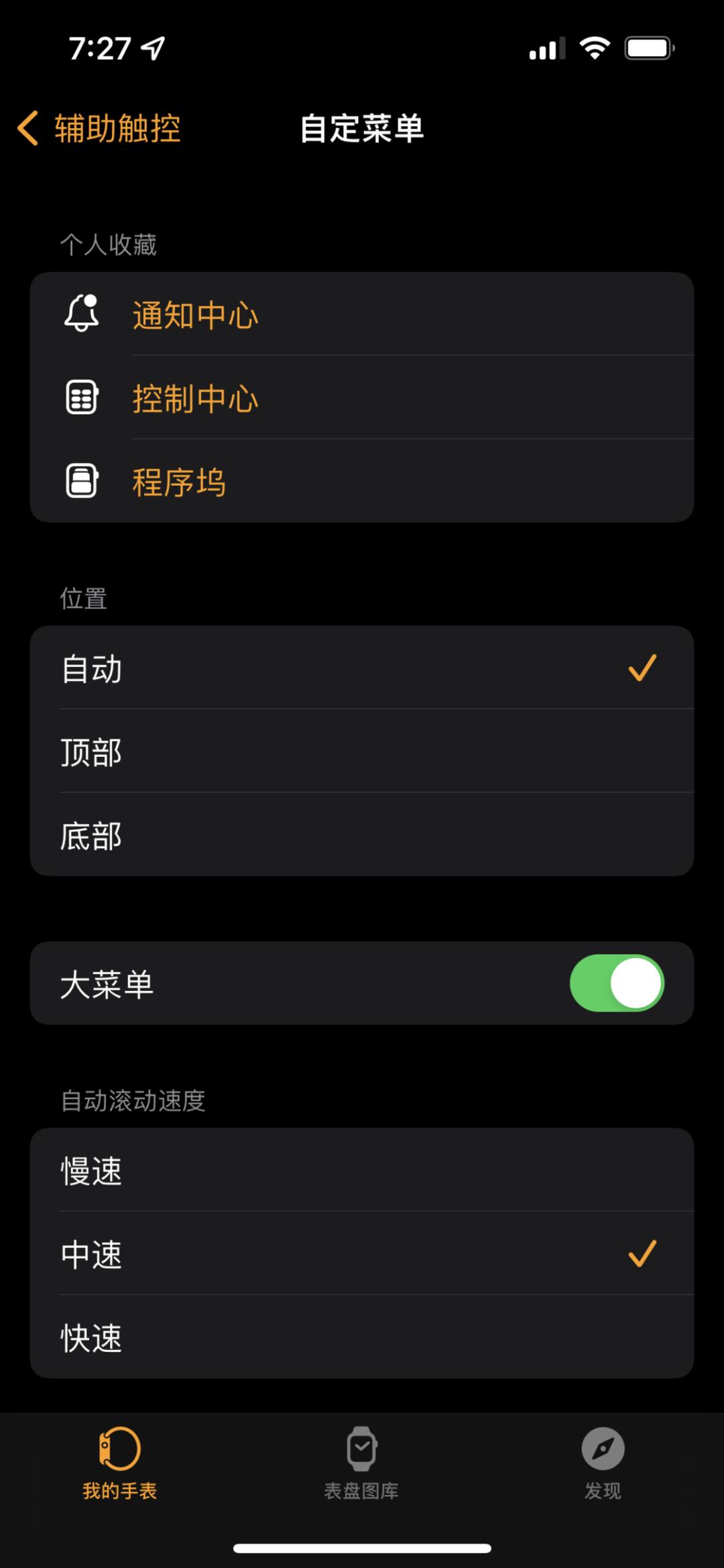 此外,在这个设置页面还可以选择功能菜单的显示位置、尺寸和自动滚动速度(独立于上述「自动滚动菜单项」设置)。
