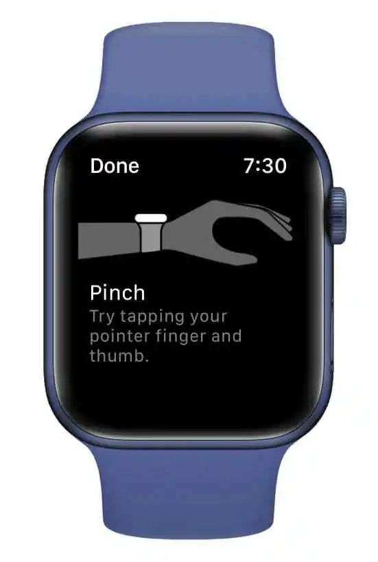 在辅助触控的帮助下,用户可以用捏指、握拳等手势代替触控操作;换言之,用一只手就可以使用 Apple Watch 上的所有功能。