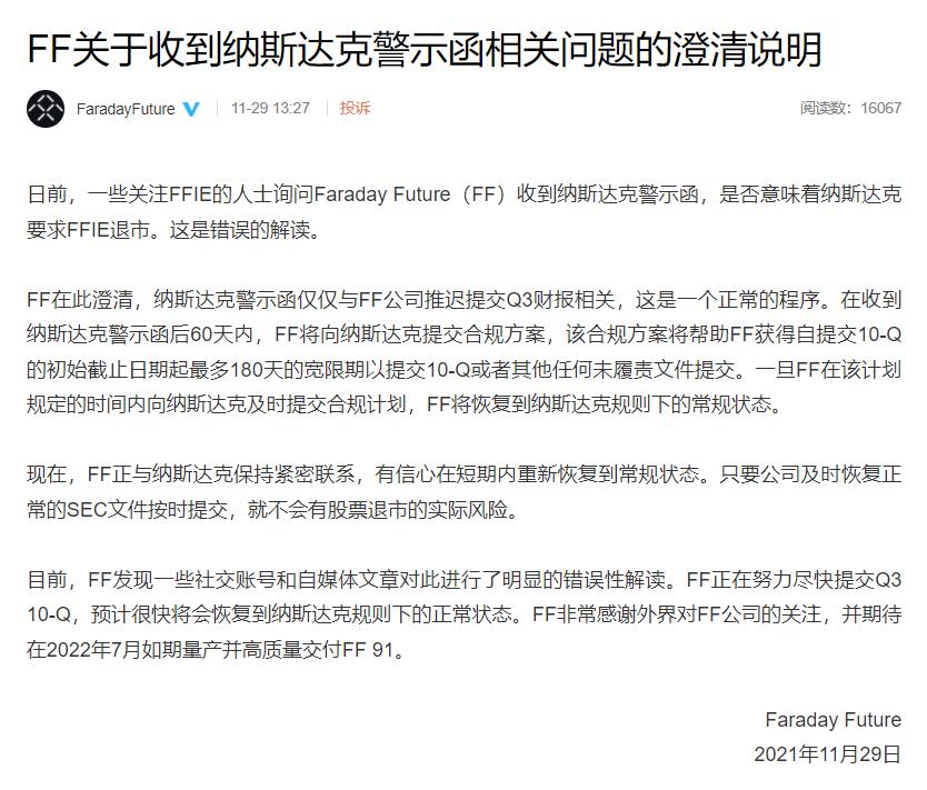 11月26日,FF收到了一份来自美国证券交易委员会发出的退市警示函。随后FF发布澄清说明,由于公司未能及时提交季度收益报告,FF被要求在60天内提交截至2021年9月30日的季报,否则可能被要求退市。