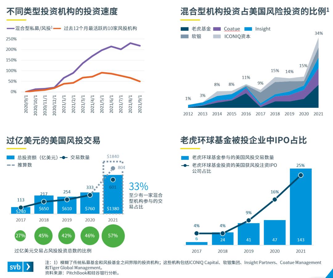 这类“混合型”投资机构部署资金的速度甚至比最活跃的传统风投基金还要快,就像标普500指数中的大科技公司一样,这类投资机构在美国风险投资市场中的占比较大。这类机构的与众不同之处,恰恰在于其部署资金的速度以及交易规模。2021年,混合型投资机构交易活跃,截至2021年3季度,过亿美元规模的交易数量从2020年的333宗跃升至601宗。到2021年底,我们预计1亿美元以上的交易数量将较2020年增长141%。