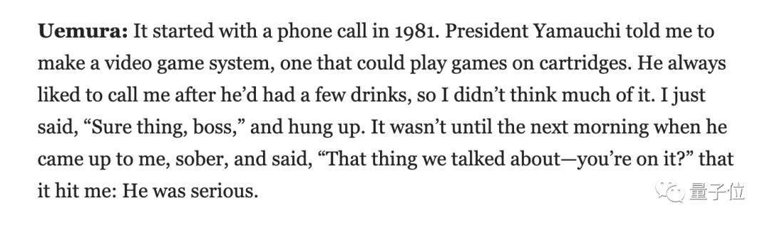 “山内社长让我做一个可以用卡带玩的电子游戏系统,他总是喝几杯之后给我打电话,所以我也没怎么想,只是口头上应了下来就挂断了。”