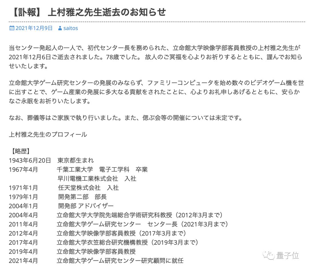 立命馆大学游戏研究中心12月9日发布讣告:红白机之父上村雅之教授于2021年12月6日去世,享年78岁。