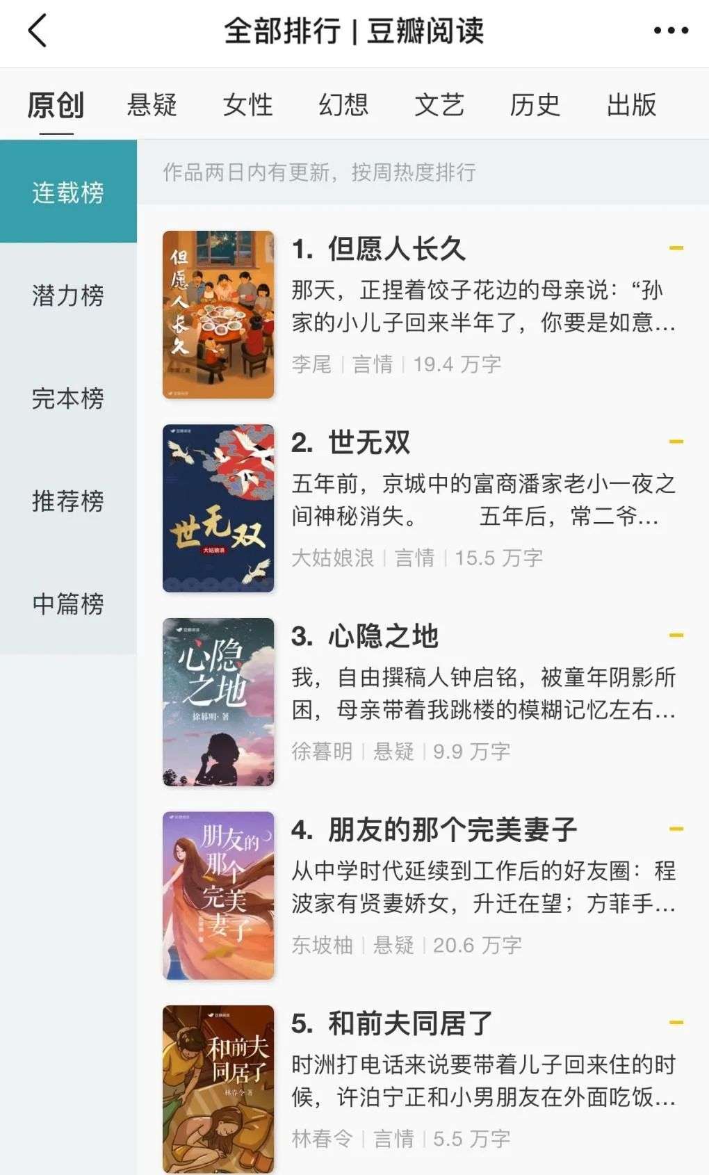 不仅如此,为了吸引更多年轻用户并提高他们的时长,豆瓣还在2012年上线了豆瓣阅读,签约了很多网络作者,现在以“原创小说”的身份成为“书影音”板块中一部分。在原创小说中有大量都市文,一些作者为了吸引读者还会在文章中加入“开车”桥段。对于“原住民”来说,这称得上是豆瓣的灾难,毕竟最初的书影音上线的都是有深度、有品味的书目。