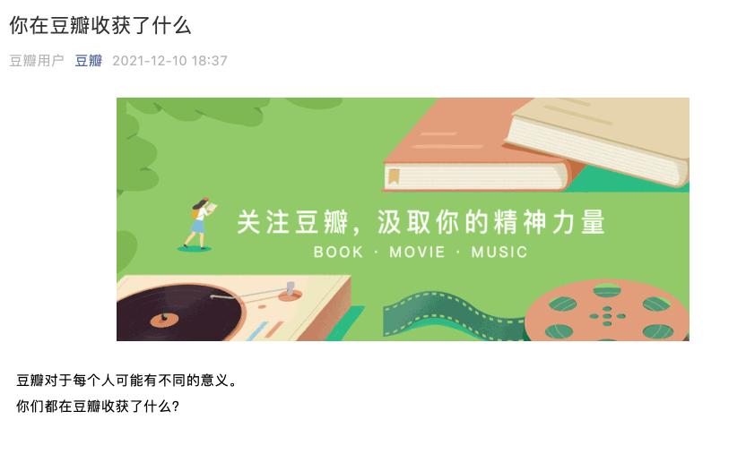 在今天豆瓣公众号发布标题为“你在豆瓣收获了什么”的推文中,有人写道“我不太敢想象没有豆瓣的生活会是怎样的,或许就像一个原本正常的人,醒来后突然发现自己变成了色盲那样。有一大块血肉被挖走。所以我希望它能长存,至少,不被外力破坏。”
