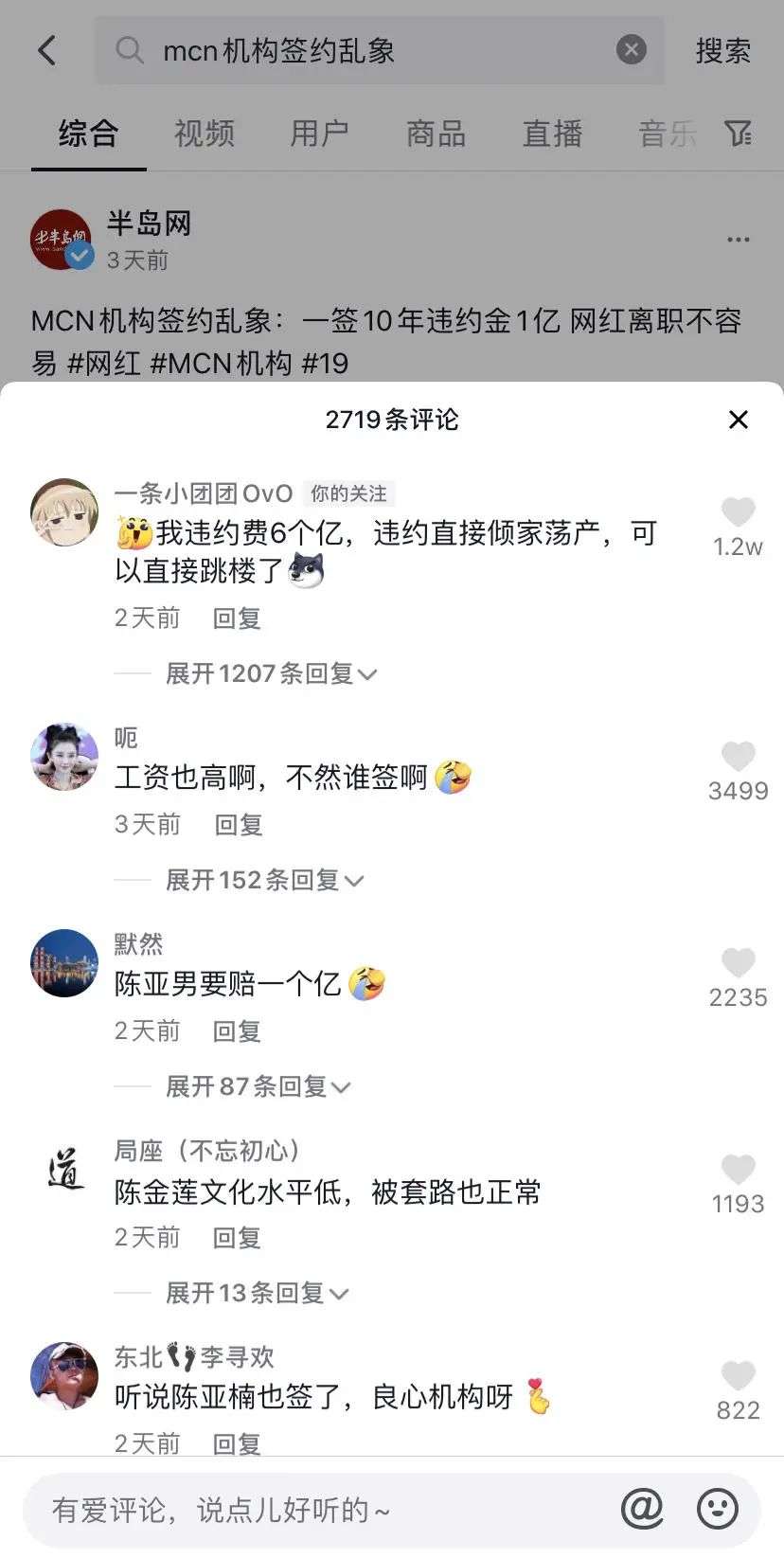 就在几天前,抖音账号“半岛网”发布视频称,某些MCN机构存在着分成比例不合理、“网红”离职时面临天价违约金的情况。