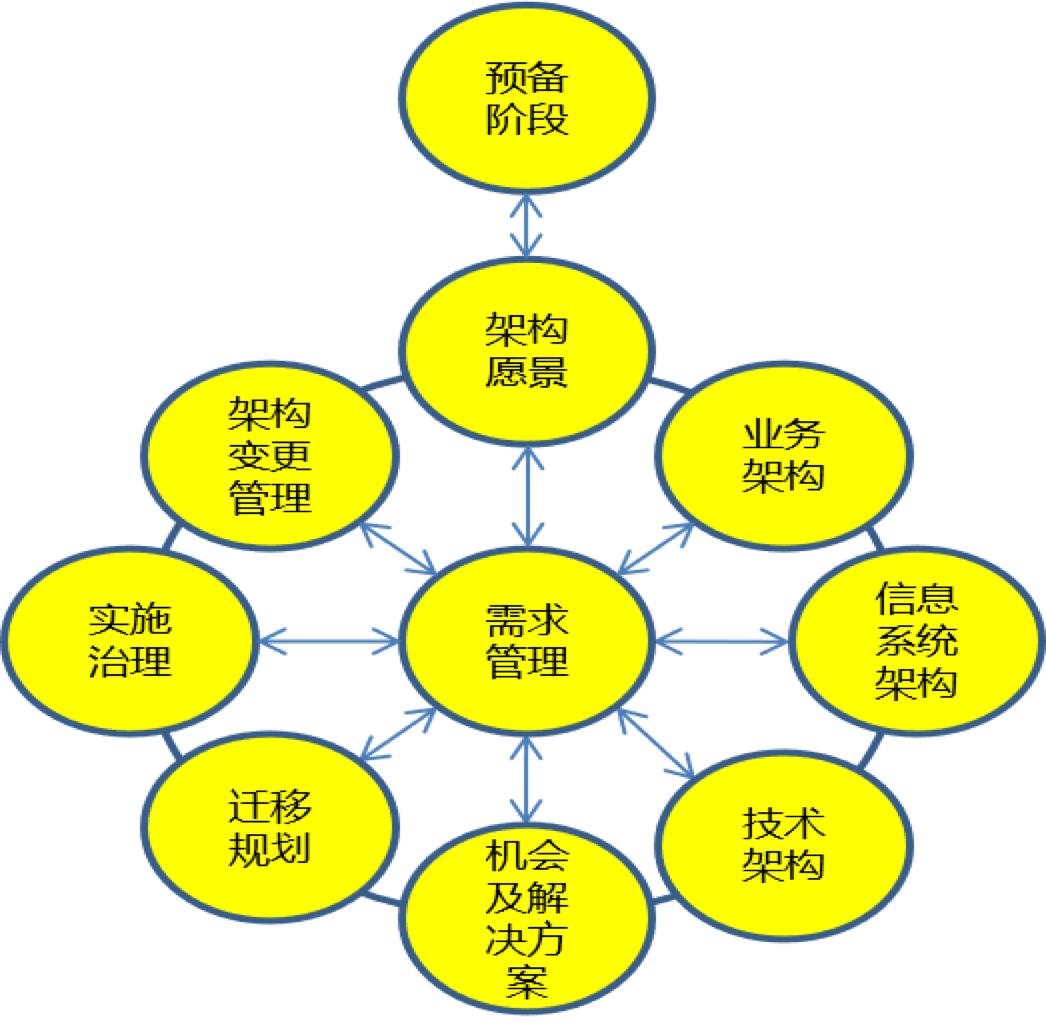 但是,不得不说,TOGAF 的很多实践还是在借用其理念而不是完整、一板一眼地按照其方法论进行实施,所以,业界也常有一个说法,就是,判断一个项目是否是 TOGAF 项目,不是看其交付物,而是看其过程。也就是说,不是对着 TOGAF 手册去检查设计文档是不是种类齐全,而是看项目执行过程是不是接近 TOGAF 的 ADM 过程模型,也就是类似下图这个过程模型: