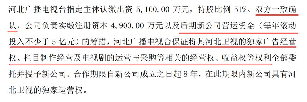 这里需要了解的是,当代东方曾与河北卫视有过一段时间的合作,双方约定成立新公司,当代东方每年向新公司投入不少于5亿元,换得合约生效后8年内河北卫视的独家运营权,包括广告、项目制作、电视剧采买等。后来,这一合作成为当代东方巨额亏损的一个“大窟窿”,仲裁后近3亿的预计负债也是由此而起。