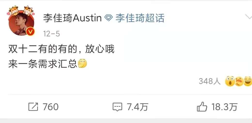 不比双11延续往年热搜刷屏,敲锣打鼓的火热气氛,淘宝今年的双12给人感觉静悄悄,在各大App采买的开屏广告也在当天才姗姗来迟。但12月5日,李佳琦发了一条征集双12消费需求的微博,下方有高达7.4万条的评论,近期他很多条微博下,都有粉丝追问何时出双12直播清单。虽没有双11的高潮迭起,双12同样暗流涌动。