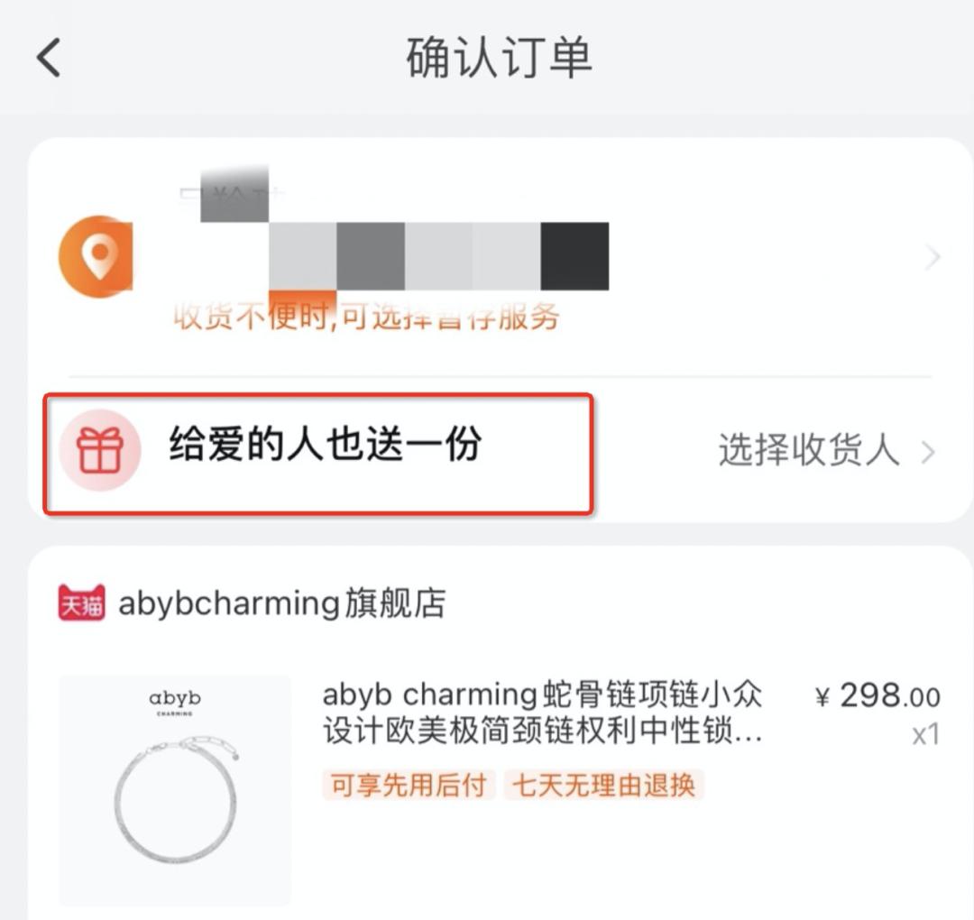 “给爱的人也买一份”这个功能在双12正式上线后,消费者可以直接在同一物品下选择两个收货人,就可以帮助亲朋好友下单,不用重复下单,两单叠加,也可以共享满减等店铺优惠。因此,商家可以通过设置满减,刺激消费者冲动下单,提升店铺ARPU值和销量。