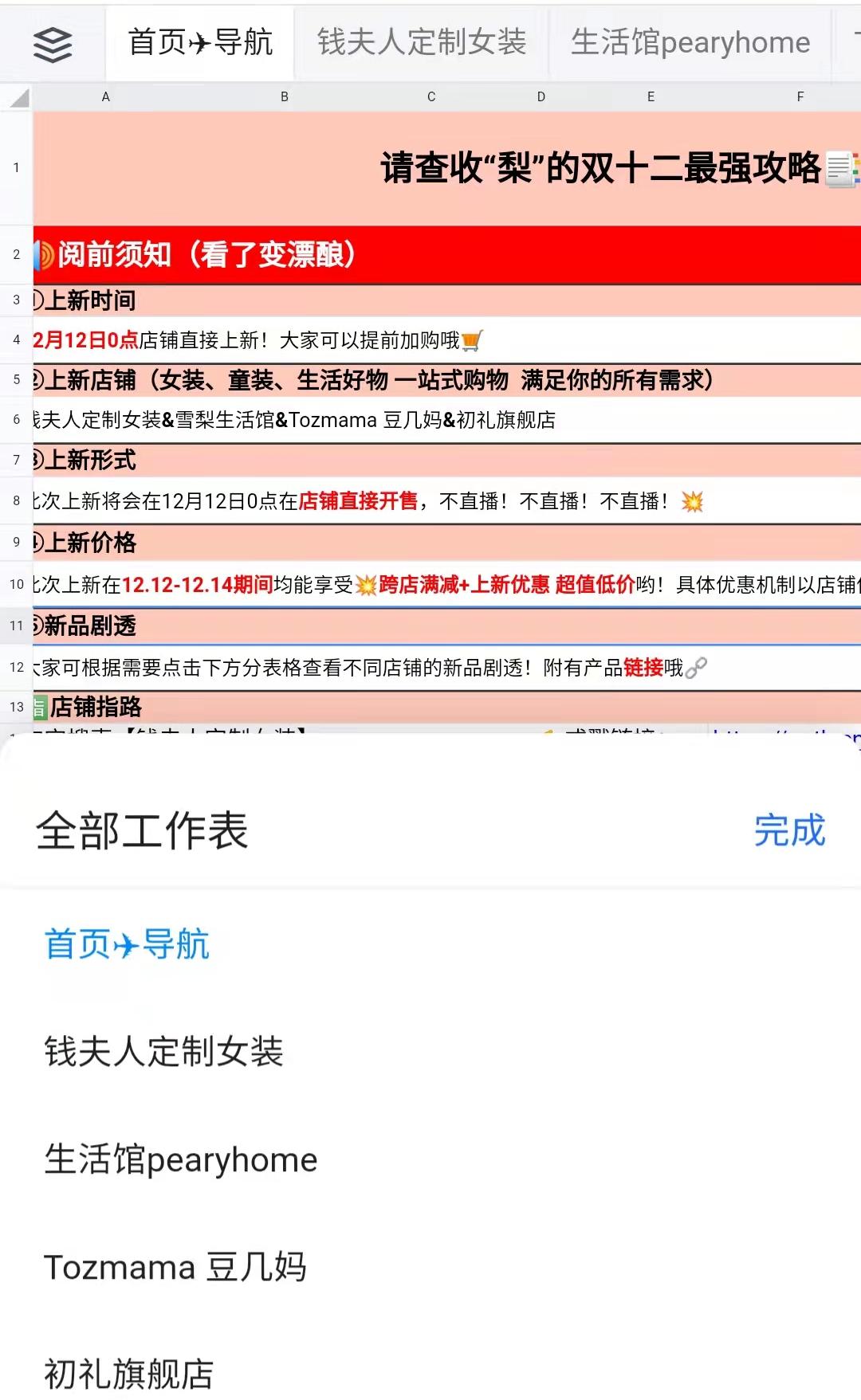 其中双12攻略以腾讯文档形式展现,品类涉及到“钱夫人定制女装”“雪梨生活馆”生活用品、“Tozmama 豆几妈”婴童、“初礼旗舰店”童装。