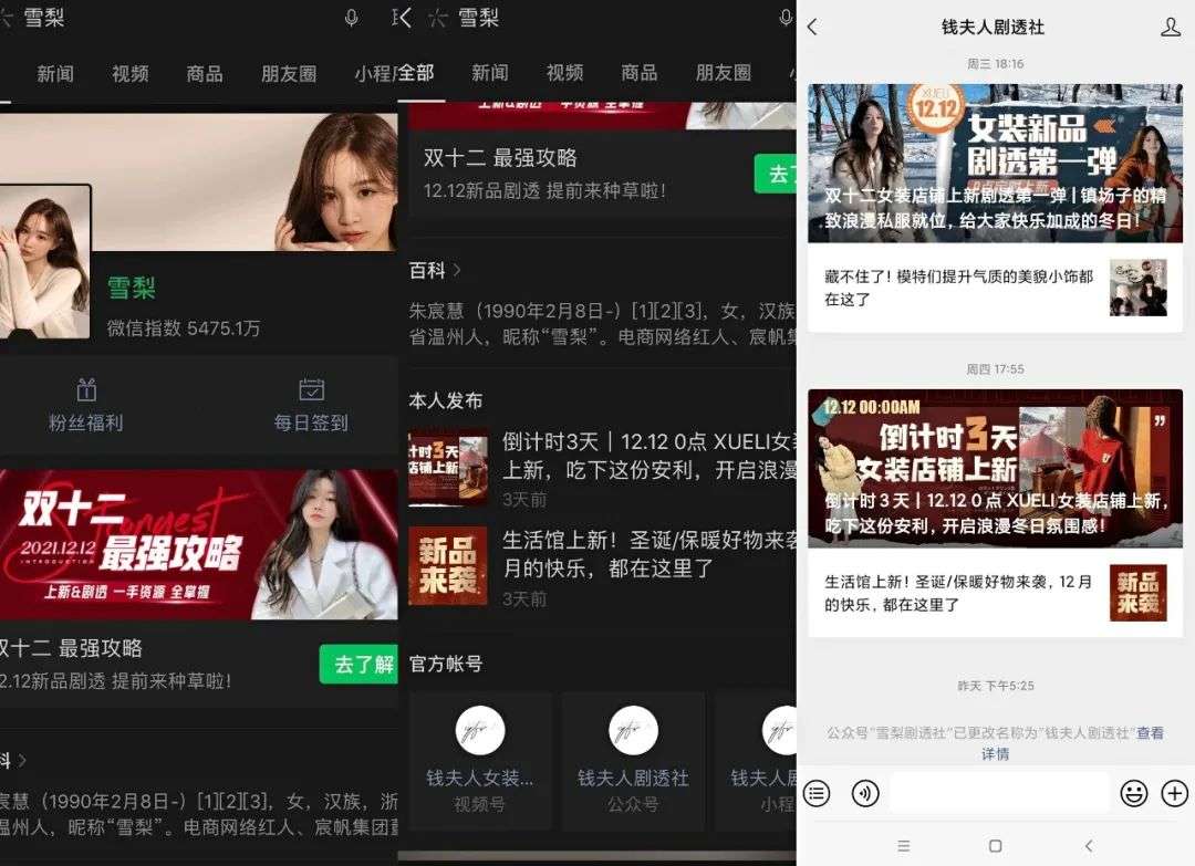 截止到12月12号,微信搜索“雪梨”仍会显示雪梨个人主页,包括双12攻略、百科、公众号近期发布、官方账号等。12月13号再次搜索则无雪梨个人主页。