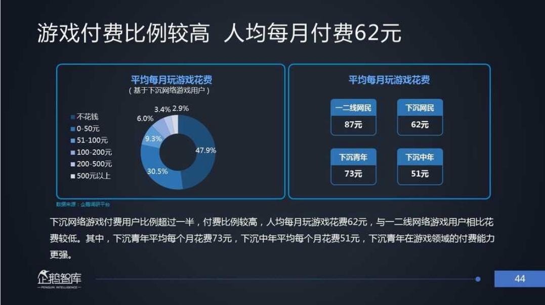 企鹅智酷《2019-2020下沉市场网民消费与娱乐白皮书》指出,下沉市场网民人均每月消费62元左右,与一、二线城市网民人均消费87元,差距并不大。