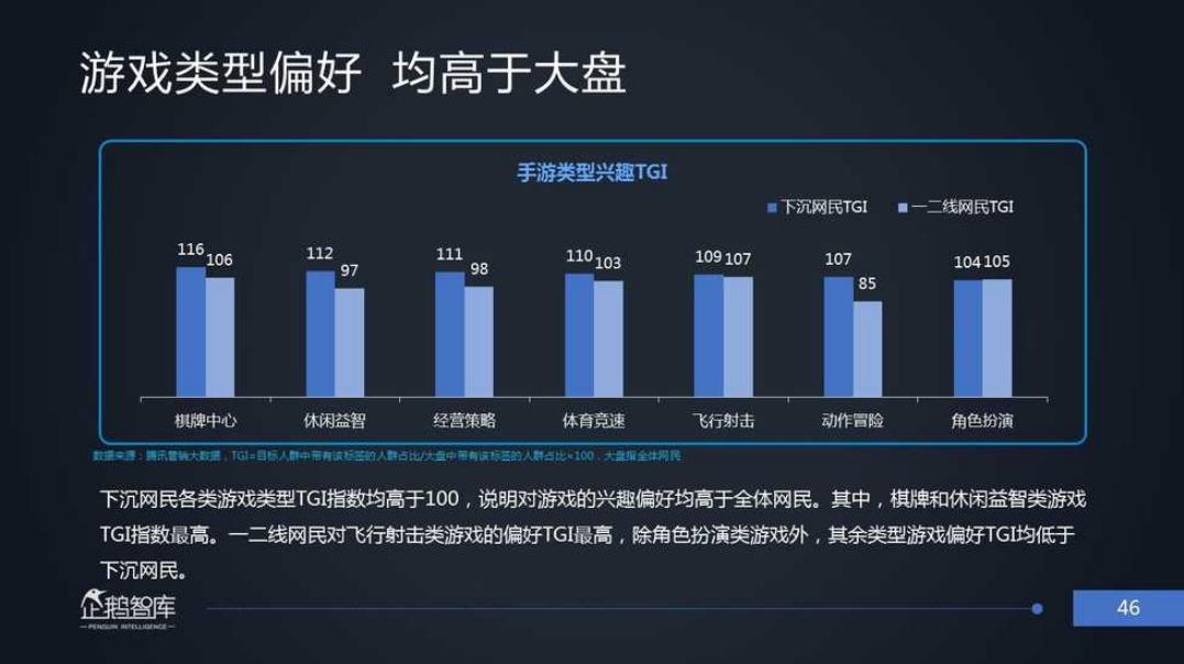 从根据手游兴趣TGI分布来看,下沉市场消费群体TGI指数明显高于100,表明下沉市场对于游戏的兴趣偏好均高于全体网民,而其中能够主抓线下同乐的“棋牌”(116)、“休闲益智”(112)类游戏,TGI指数最高;而较为依赖硬件设备质量的增强游戏体验的“飞行射击”(107)、“角色扮演”(105)类手游,则是一、二线城市网民的主要偏好类目。