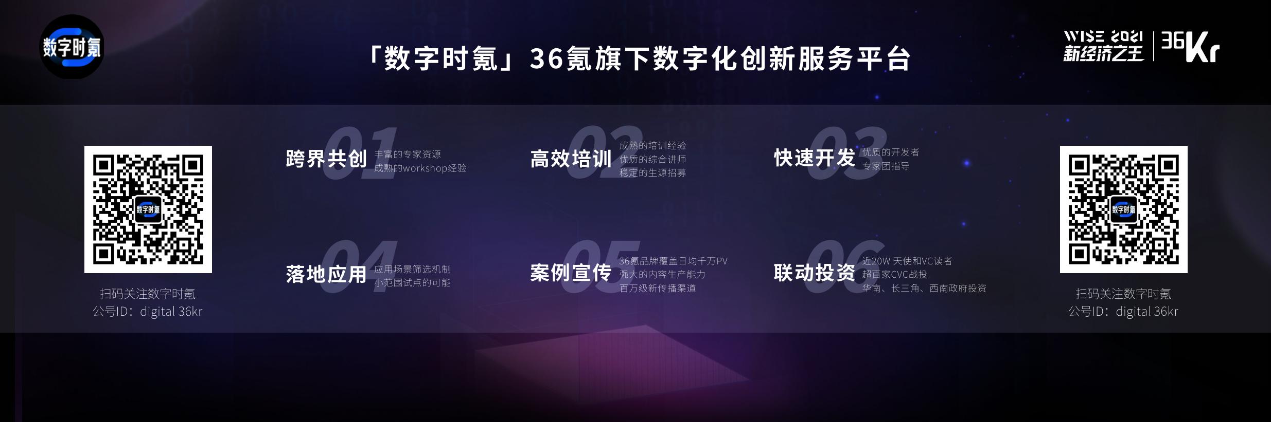 这件事情其实不容易,但是我们相信以36氪的资源和禀赋以及我们的努力,能够提供一些对行业有价值的东西。也许是一些跨界的共创,也许是一些高效的培训,也许是帮助开发者更快的开发、更快的落实应用,帮助他们找到合适的投资,也想是帮这些创新者宣传他们的案例,将他们的数字化理念传播到更远的地方。