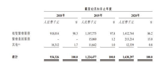 营收情况如何呢?招股书显示,2018年、2019年以及2020年,雍禾医疗的营收分别是人民币9.343亿元、12.2亿元以及16.4亿元,增长速度保持在30%以上。当然,它的收入主要来自提供植发医疗服务。