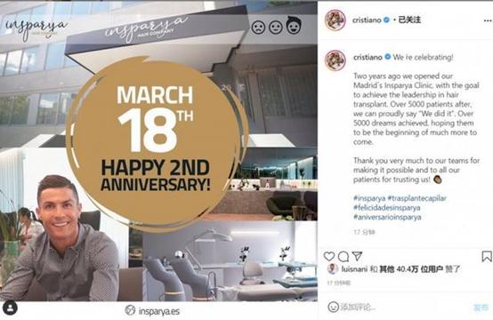 更早以前,还有许多名人也早已加入到“拯救头发”的队伍中来。2019年3月,著名球星C罗以2500万欧元巨资入股葡萄牙一家大型连锁植发机构,并在西班牙马德里开出旗舰店,一度引发轰动。今年3月,C罗还特意在个人社交媒体上发声,庆祝名下植发中心成立两周年,“治疗了超过5000名患者”。