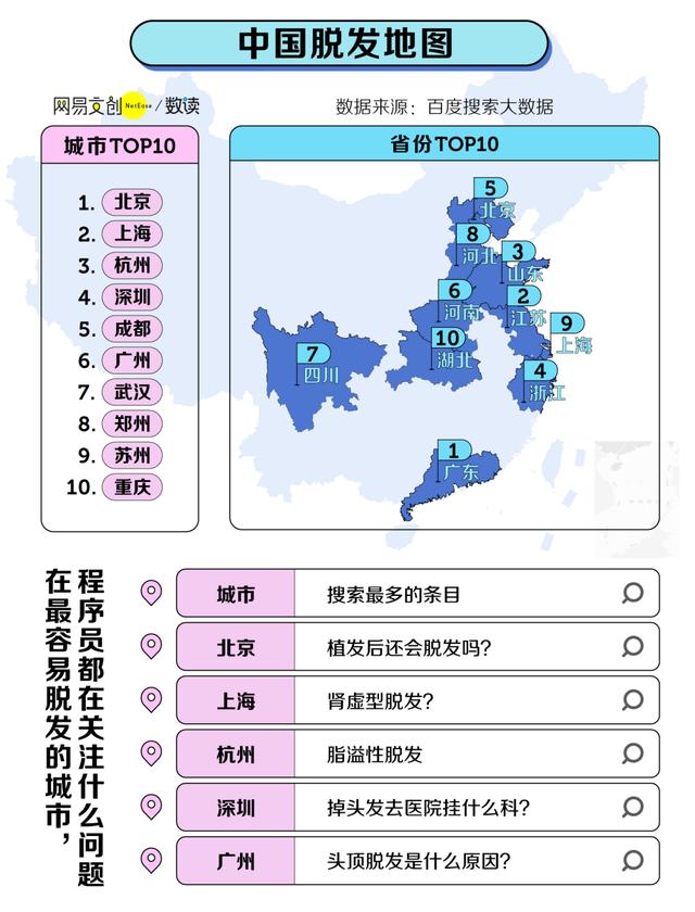 从地域上来看,秃头大军扎堆一线城市,百度搜索大数据显示,北上广深悉数上榜脱发城市TOP10,此外互联网重镇杭州冲进第三,成都、武汉、郑州等新一线城市也挤入脱发的行列。