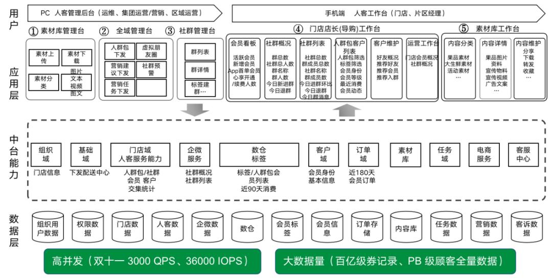 ② 最好从私域搭建之初就落实会员数字化,把用户 ID 和各个系统打通,后续的运营精细化才能如期,也即前端、中台、后端及三方能力(企业微信等技术工具)也应从开始就考虑,而非中途下车加油。