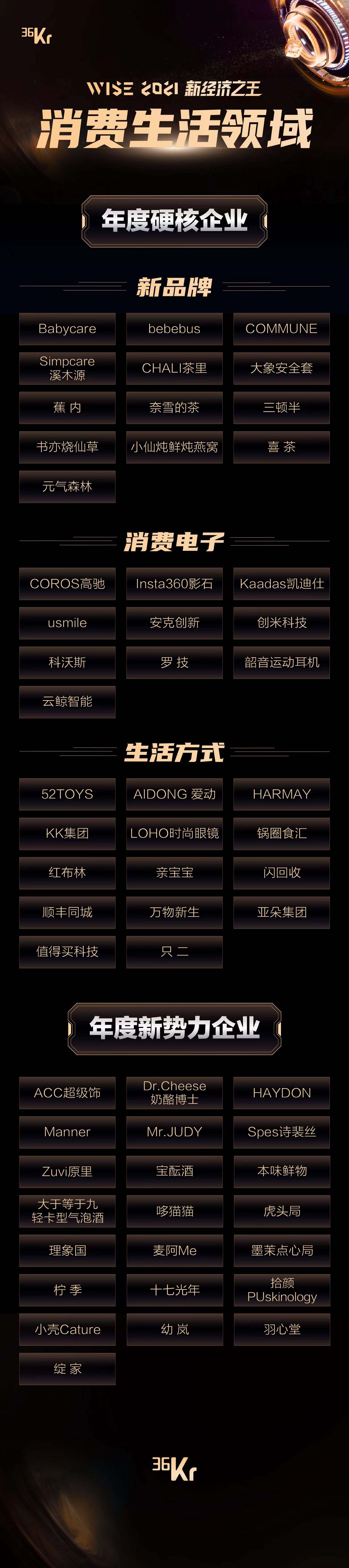 以下为WISE 2021 新经济之王 消费生活领域「年度硬核企业」、「年度新势力企业」: