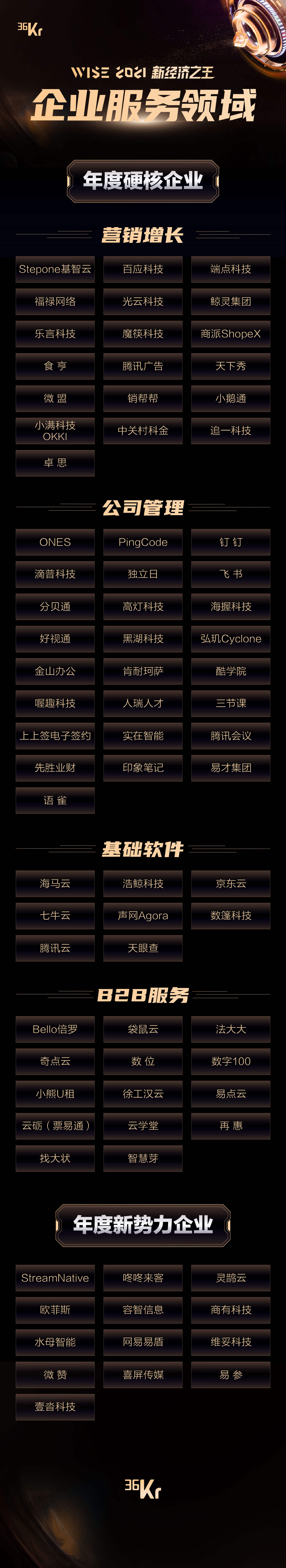 以下为WISE 2021 新经济之王 企业服务领域「年度硬核企业」、「年度新势力企业」: