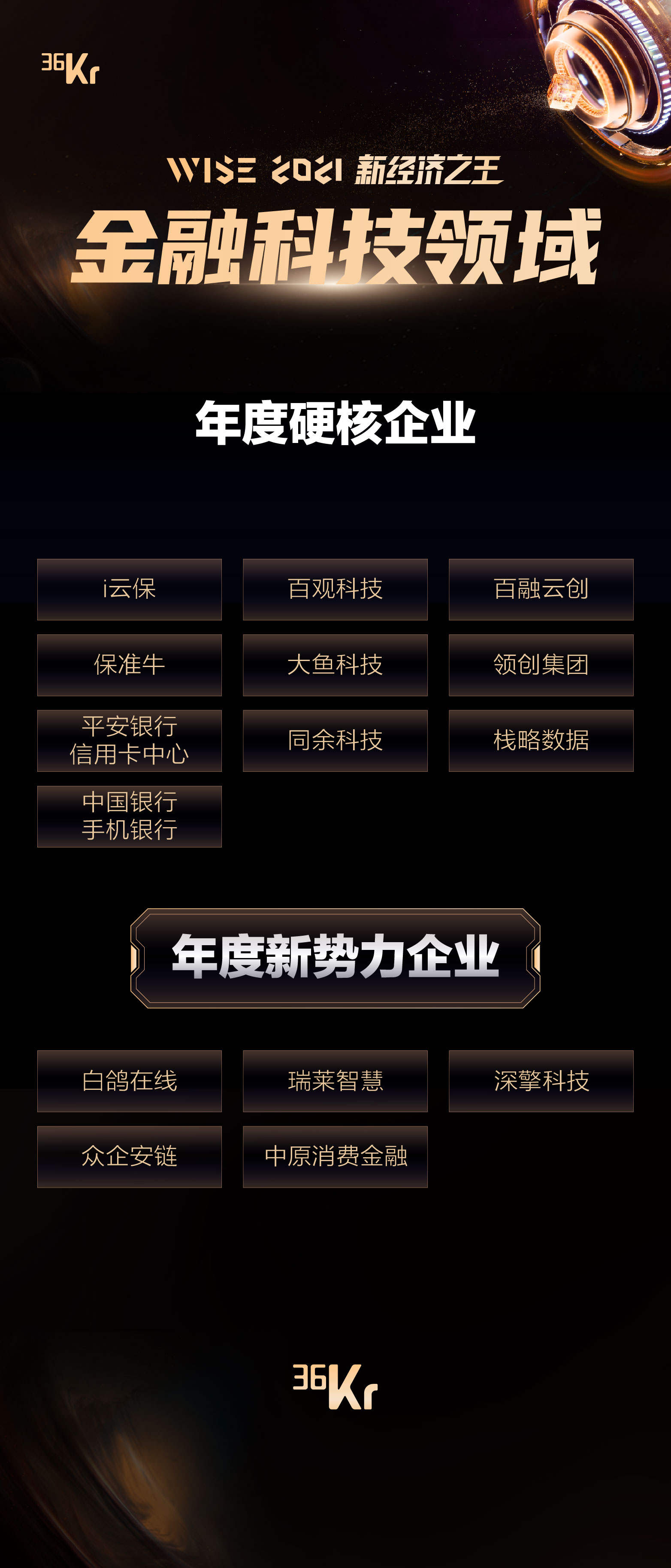 以下为WISE 2021 新经济之王金融科技领域「年度硬核企业」、「年度新势力企业」: