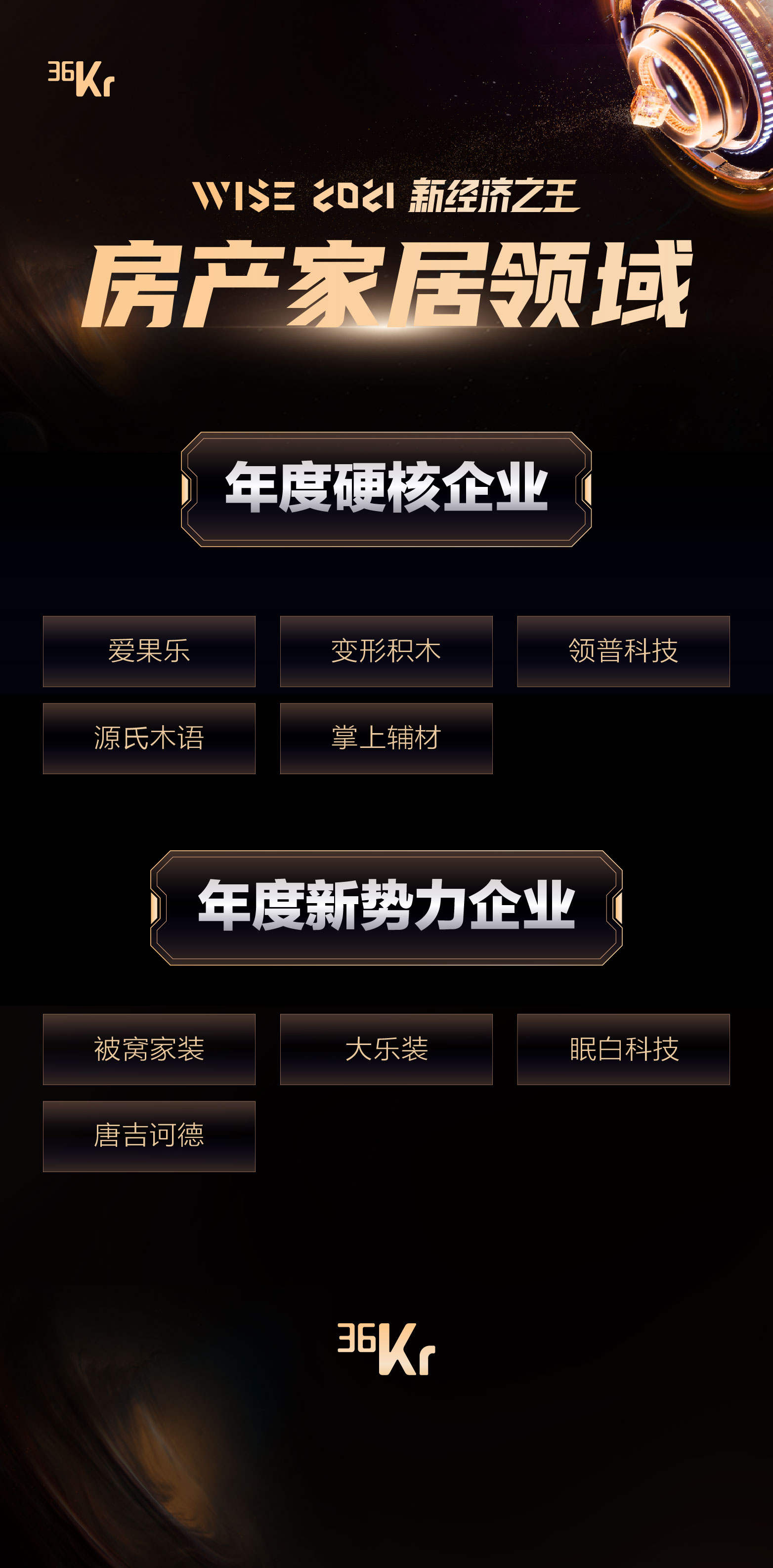 以下为WISE 2021 新经济之王房产家居领域「年度硬核企业」、「年度新势力企业」: