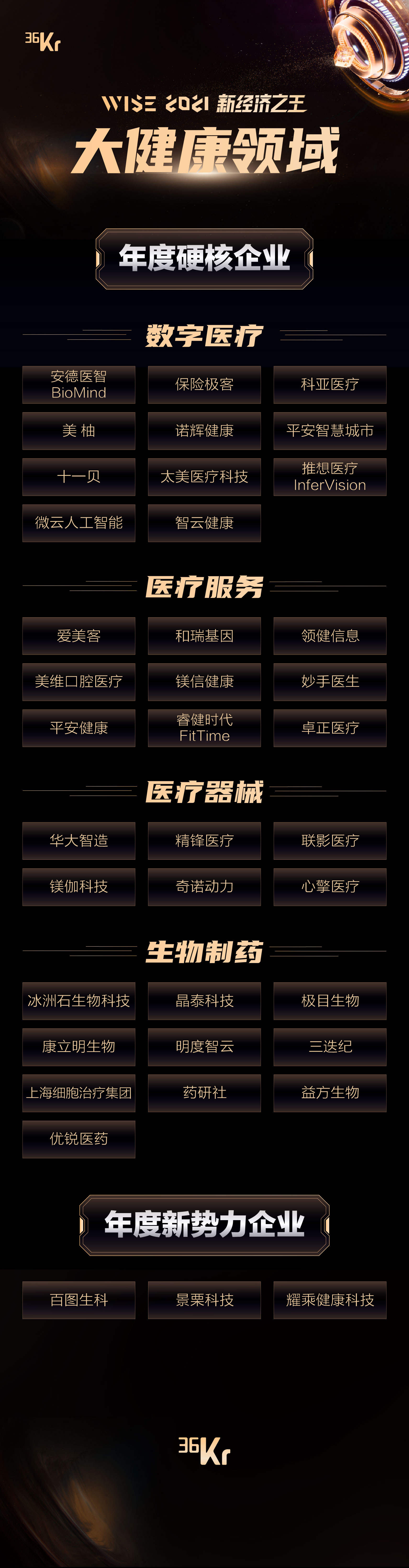 以下为WISE 2021 新经济之王 大健康领域「年度硬核企业」、「年度新势力企业」: