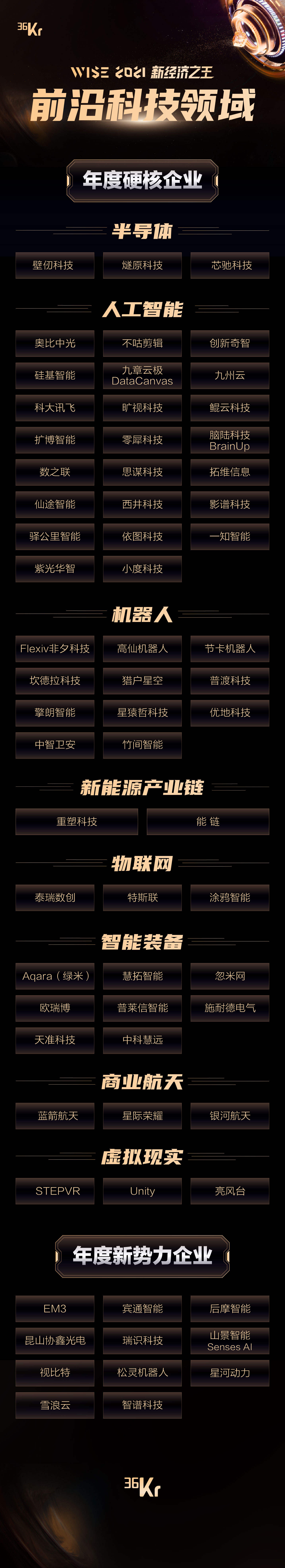 以下为WISE 2021 新经济之王 前沿科技领域「年度硬核企业」、「年度新势力企业」: