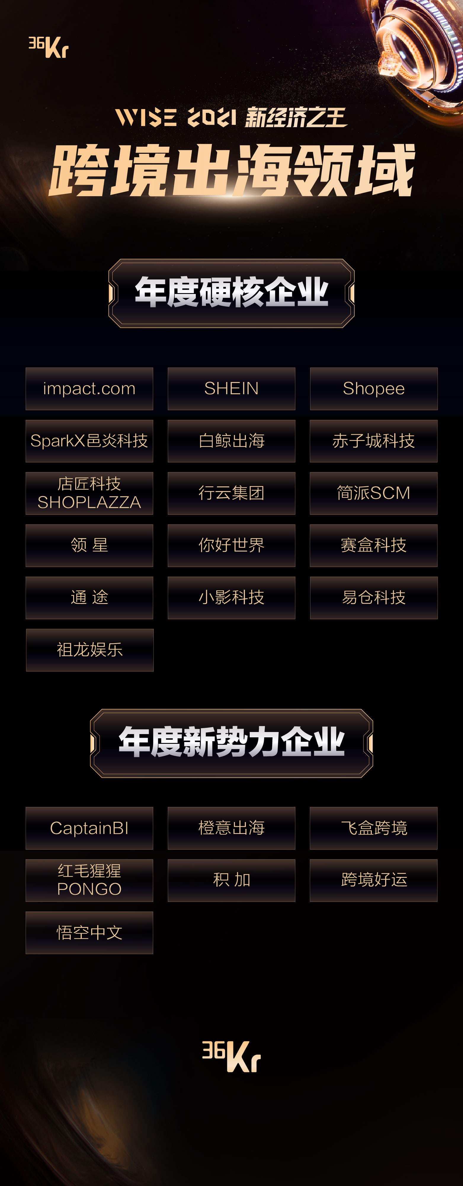 以下为WISE 2021 新经济之王 跨境出海领域「年度硬核企业」、「年度新势力企业」: