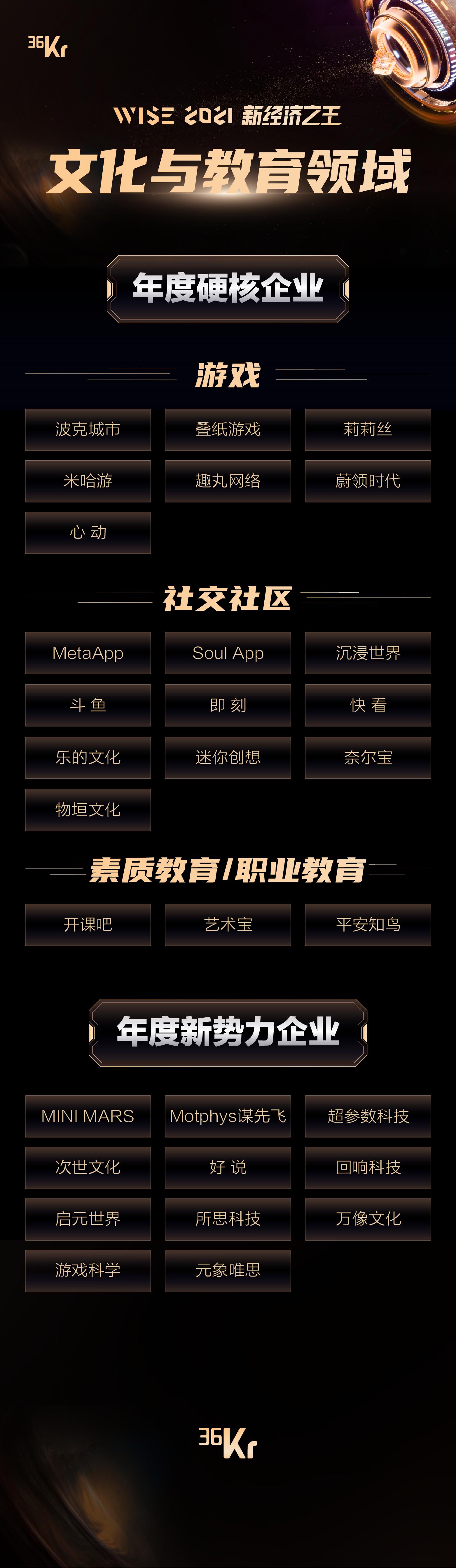 以下为WISE 2021 新经济之王文化与教育领域「年度硬核企业」、「年度新势力企业」:
