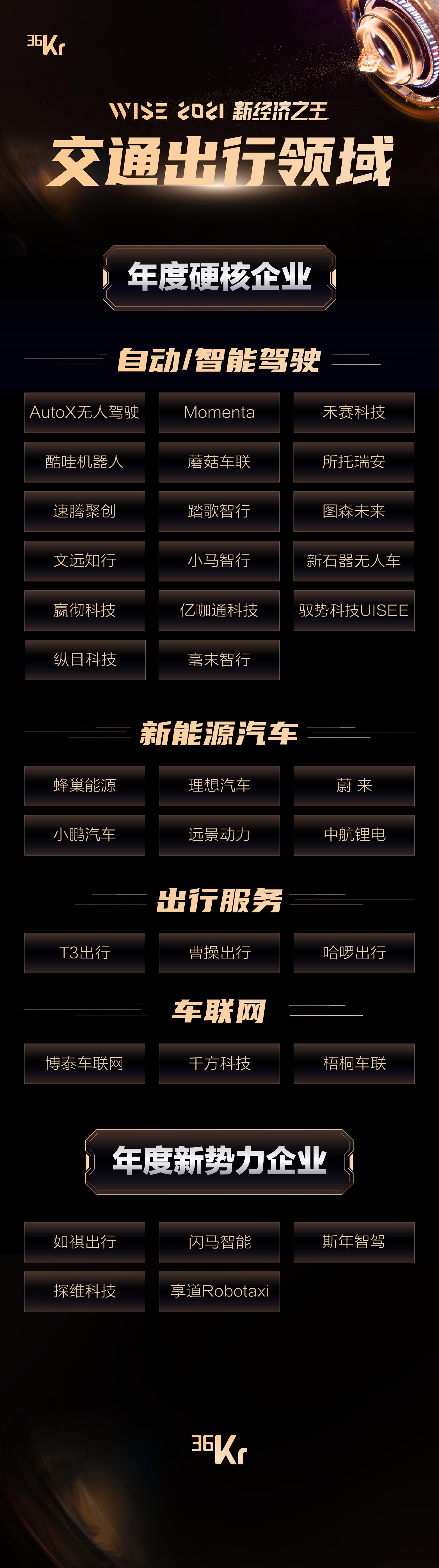 以下为WISE 2021 新经济之王 交通出行领域「年度硬核企业」、「年度新势力企业」: