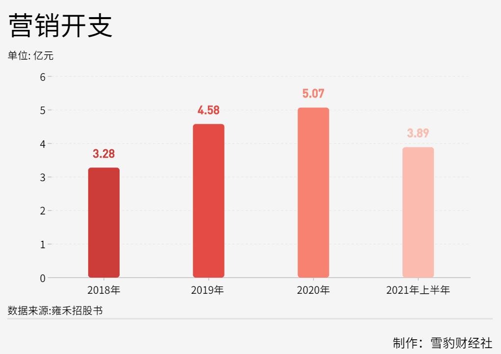 招股书显示,2018年至2019年,雍禾医疗的营销开支连年攀升,营销费用率分别为49.6%、53.1%、47.6%;2021年上半年,雍禾医疗的营销开支达到3.89亿元,超过2018年全年。