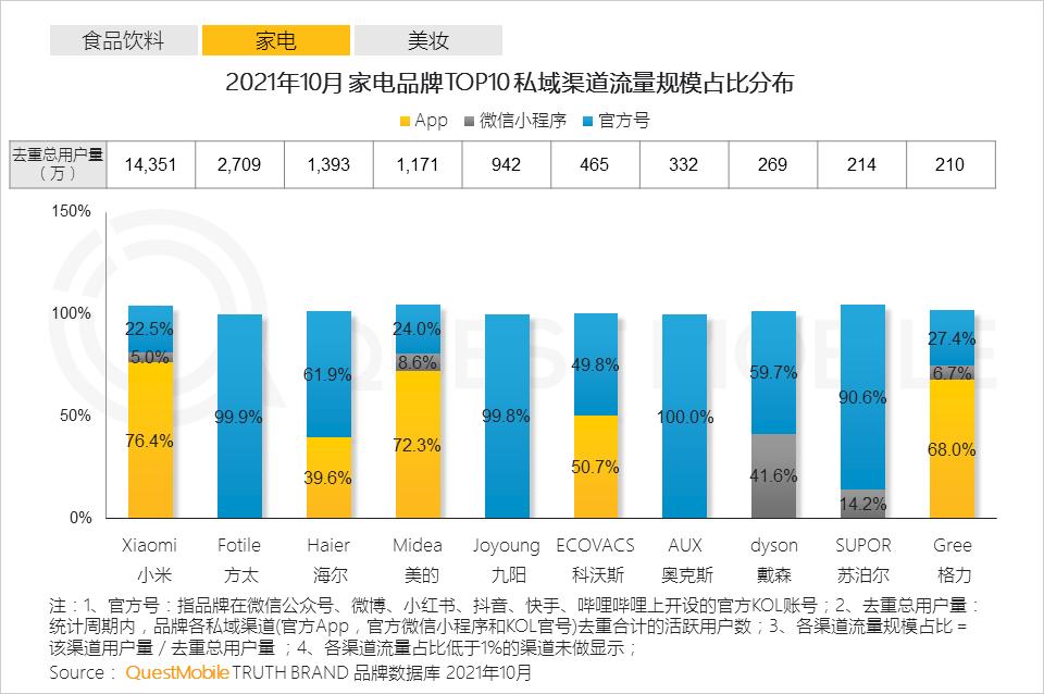 2、伴随智能家电设备升级,越来越多的家电品牌通过APP、小程序等实现设备互联,KOL官方号与APP、小程序协同实现家电品牌私域流量提升
