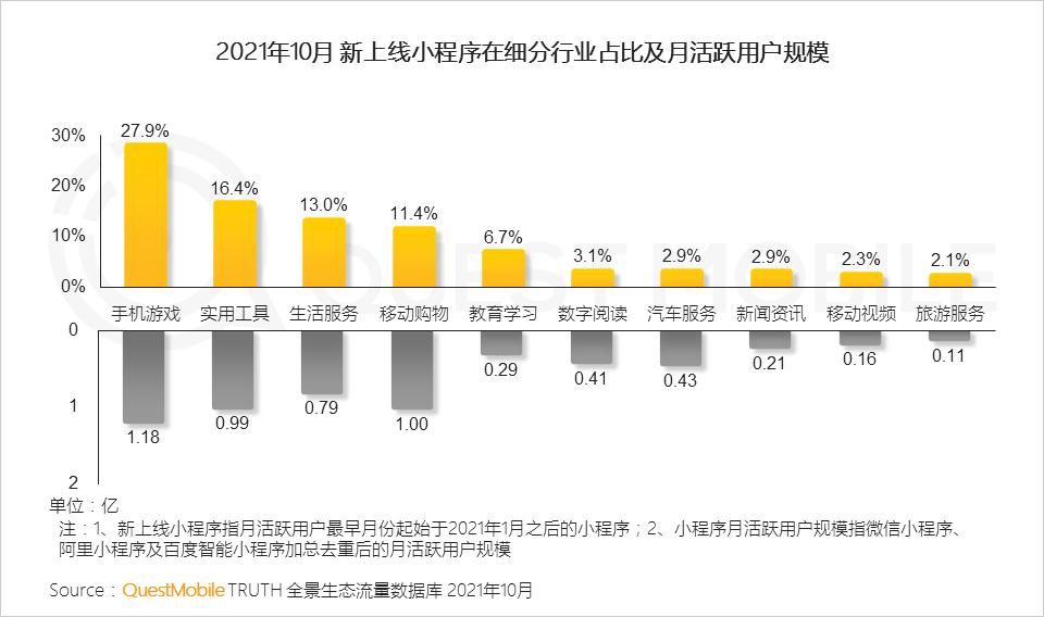 小程序流量、多场景流量加持之下,应用的用户规模持续提升,移动购物、生活服务、办公商务等领域更多应用实现亿级用户突破。小程序游戏因为开发成本低、使用便捷,仍是开发的热点,在2021年10月新上线小程序中占比27.9%,不过,随着小程序行业的逐渐成熟化,新入局玩家规模化增长难度持续提升……