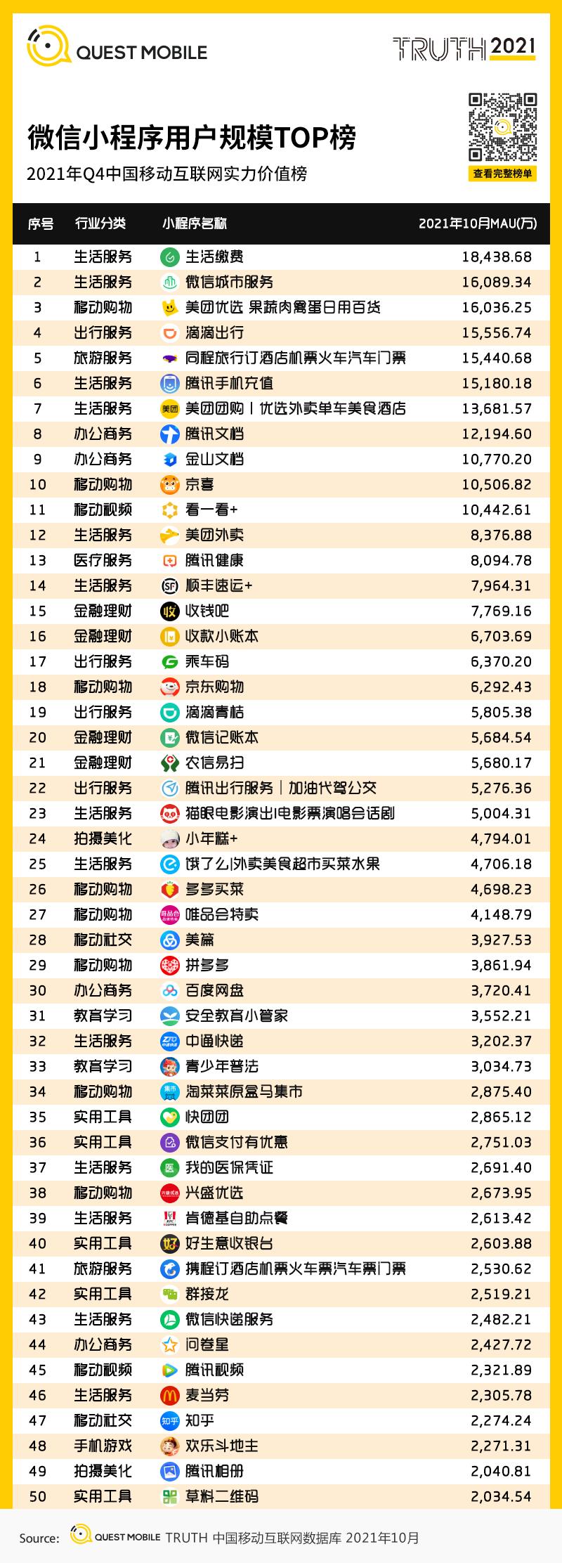 2、微信小程序用户规模TOP榜