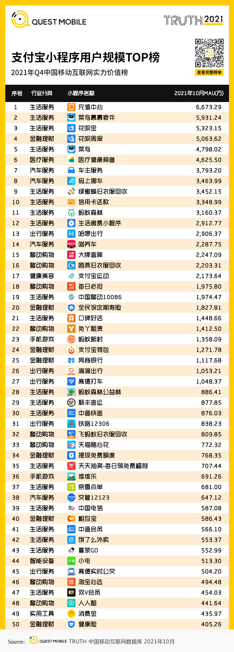 3、支付宝小程序用户规模TOP榜