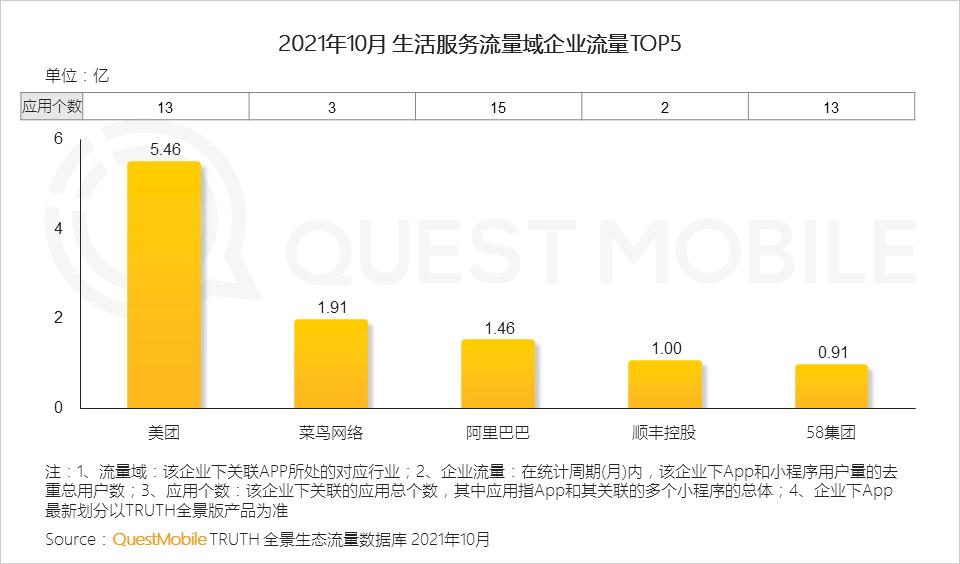 3.1 生活服务行业多企业进行重点布局,美团、阿里巴巴、58投入应用个数均达两位数