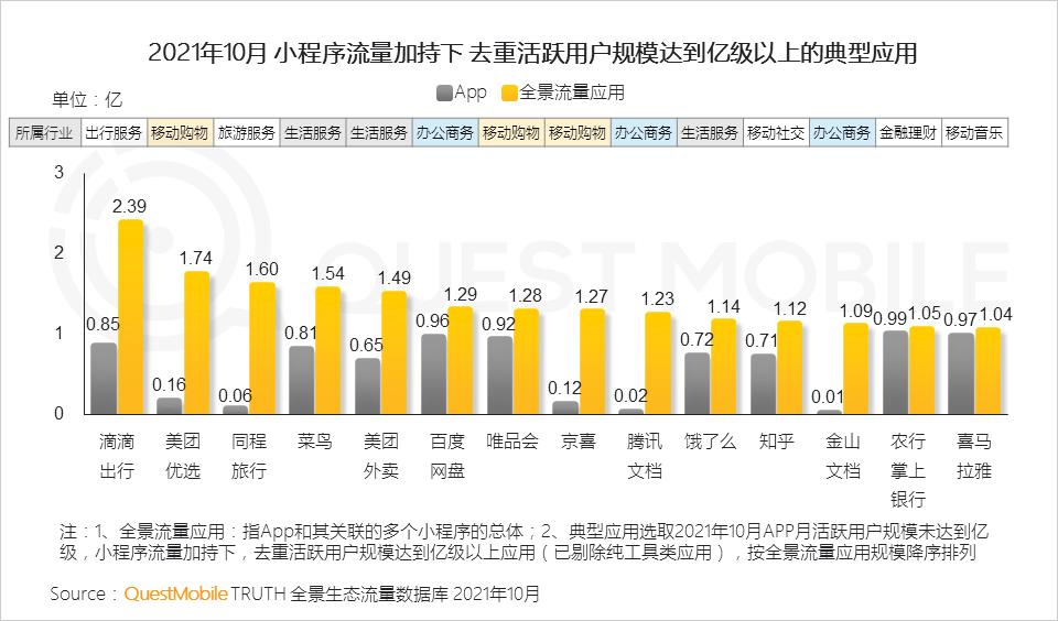 6、小程序流量加持下,帮助应用实现用户规模提升,其中移动购物、生活服务、办公商务等领域更多应用收获小程序流量,实现亿量级突破