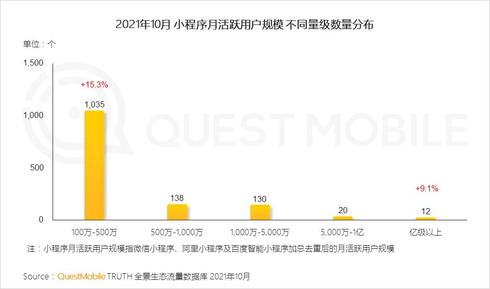 今天Mr.QM跟大家分享一下“全景生态流量”洞察报告。QuestMobile数据显示,截止到2021年10月,月活用户百万以上的小程序数量已经突破1335个,其中,亿级以上12个,5,000万到亿级之间为20个。百万到500万之间数量为1,035个,同比增长了15.3%。