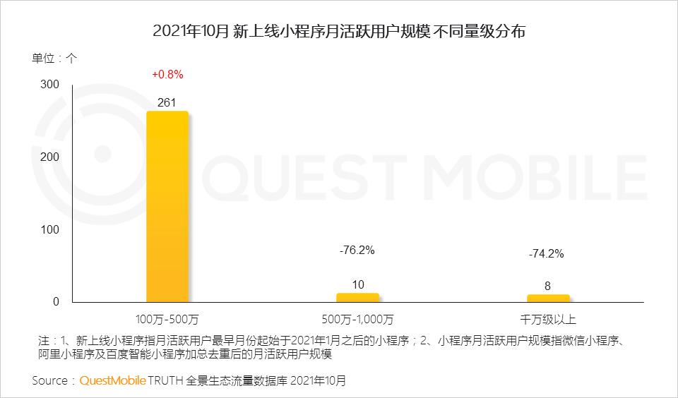 2、百万级以上小程序,增长呈现两端分化,100万-500万量级及亿量级小程序均有增长