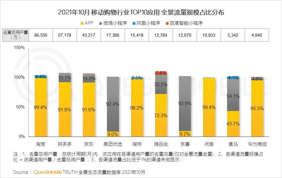 2.2 小程序持续为购物类APP带来多元化流量供给,其中美团优选、盒马等社区团购类平台小程序流量占比突出,京喜等面向下沉市场特价购物平台亦通过小程序收获亿量级流量