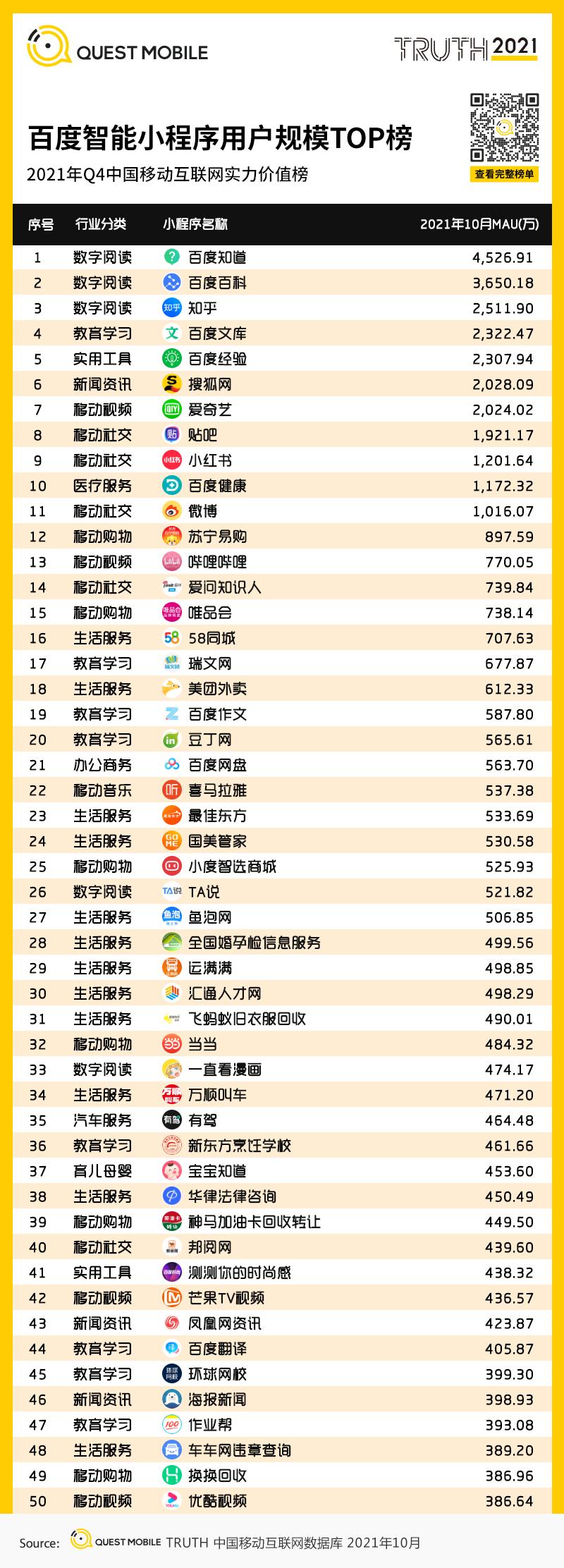 4、百度智能小程序用户规模TOP榜